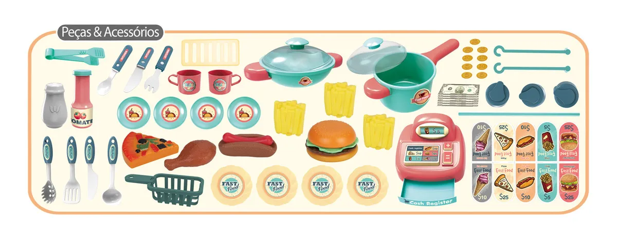 O kit inclui réplicas de hambúrgueres, fatias de pizza, porções de batata frita e caixas de pipoca, elementos que são imediatamente reconhecíveis e altamente desejáveis para o paladar infantil.